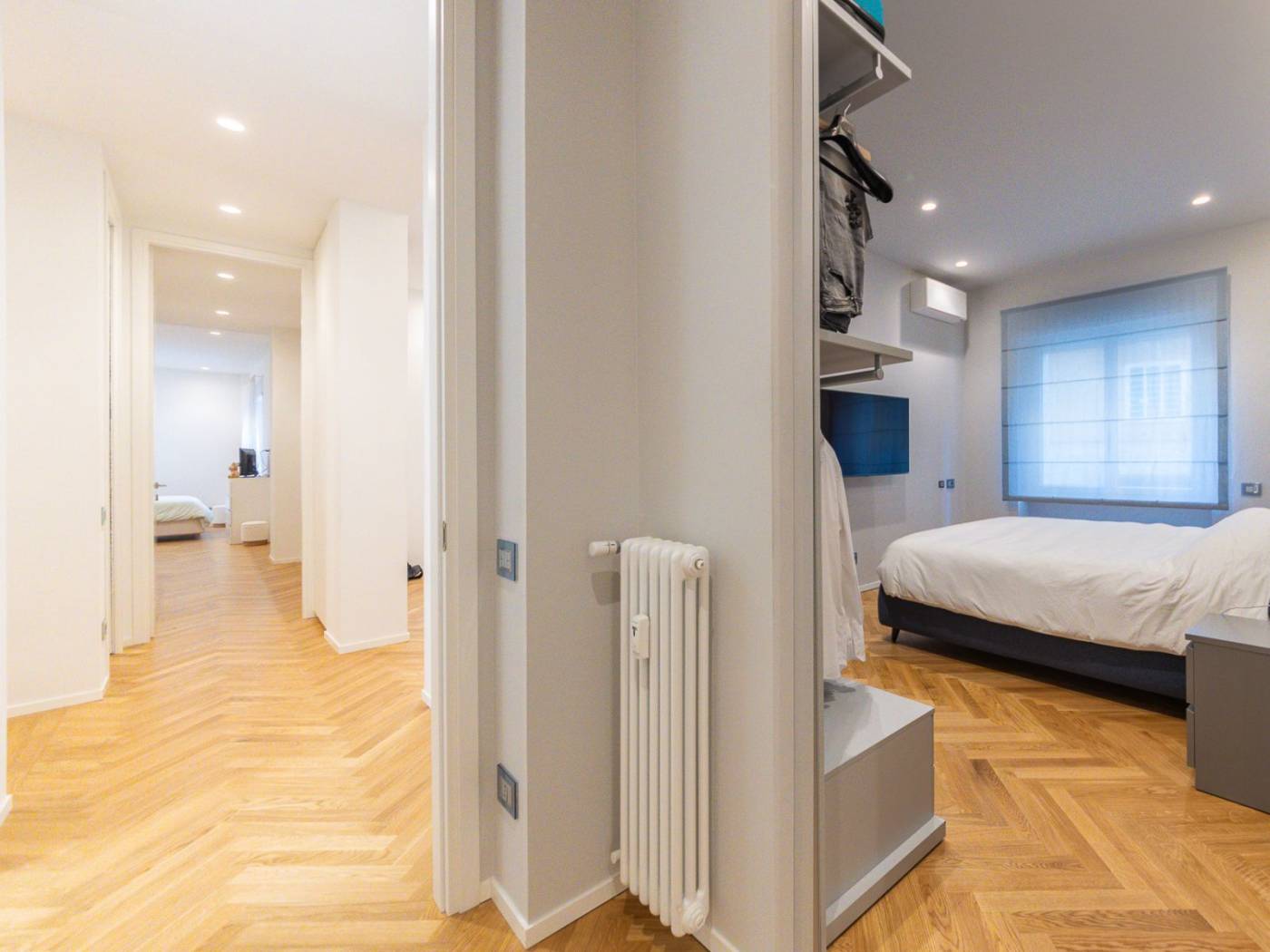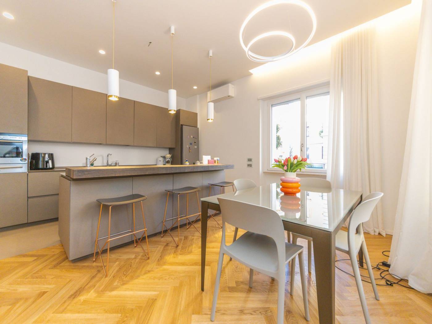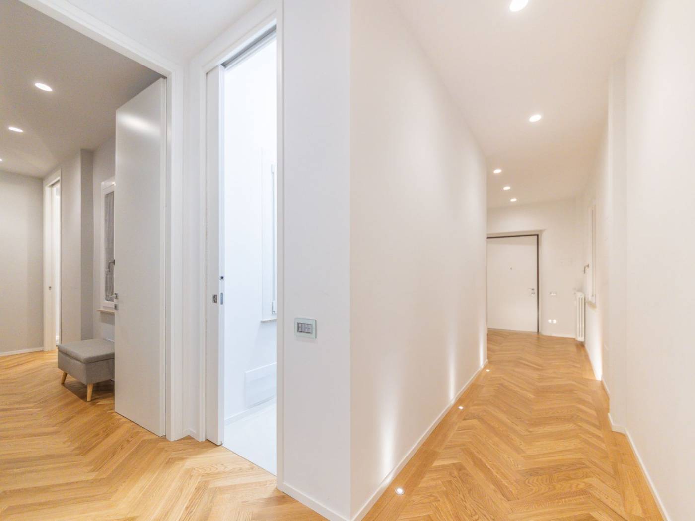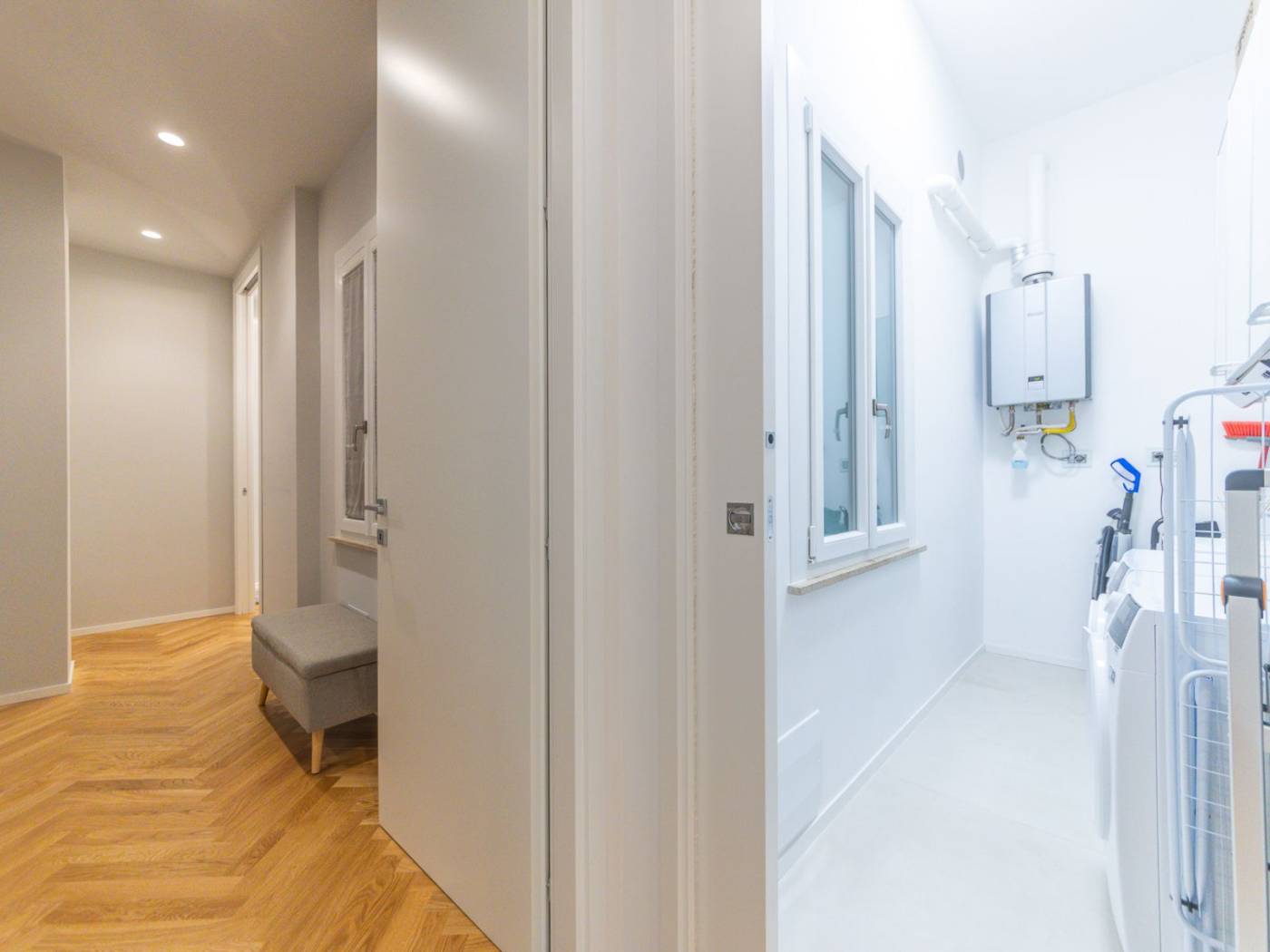 Ogni ambiente è dotato di impianti all'avanguardia: dall'impianto idraulico rinnovato, alle porte blindate, agli armadi a muro su misura, passando per la cucina Ernesto Meda, attrezzata con penisola, doppio forno, piano cottura a induzione e doppio lavandino. Inoltre, la presenza di climatizzatori in ogni stanza e delle prese internet, assicura un comfort tecnologico senza compromessi. I tre bagni sono arredati con docce walk-in e finiture di pregio, mentre le camere sono arredate con gusto, con luci in vetro e parquet a spighe che arricchiscono gli spazi.