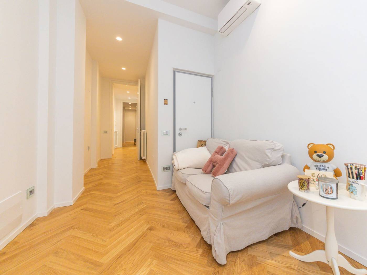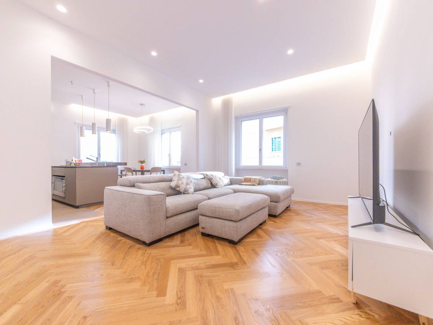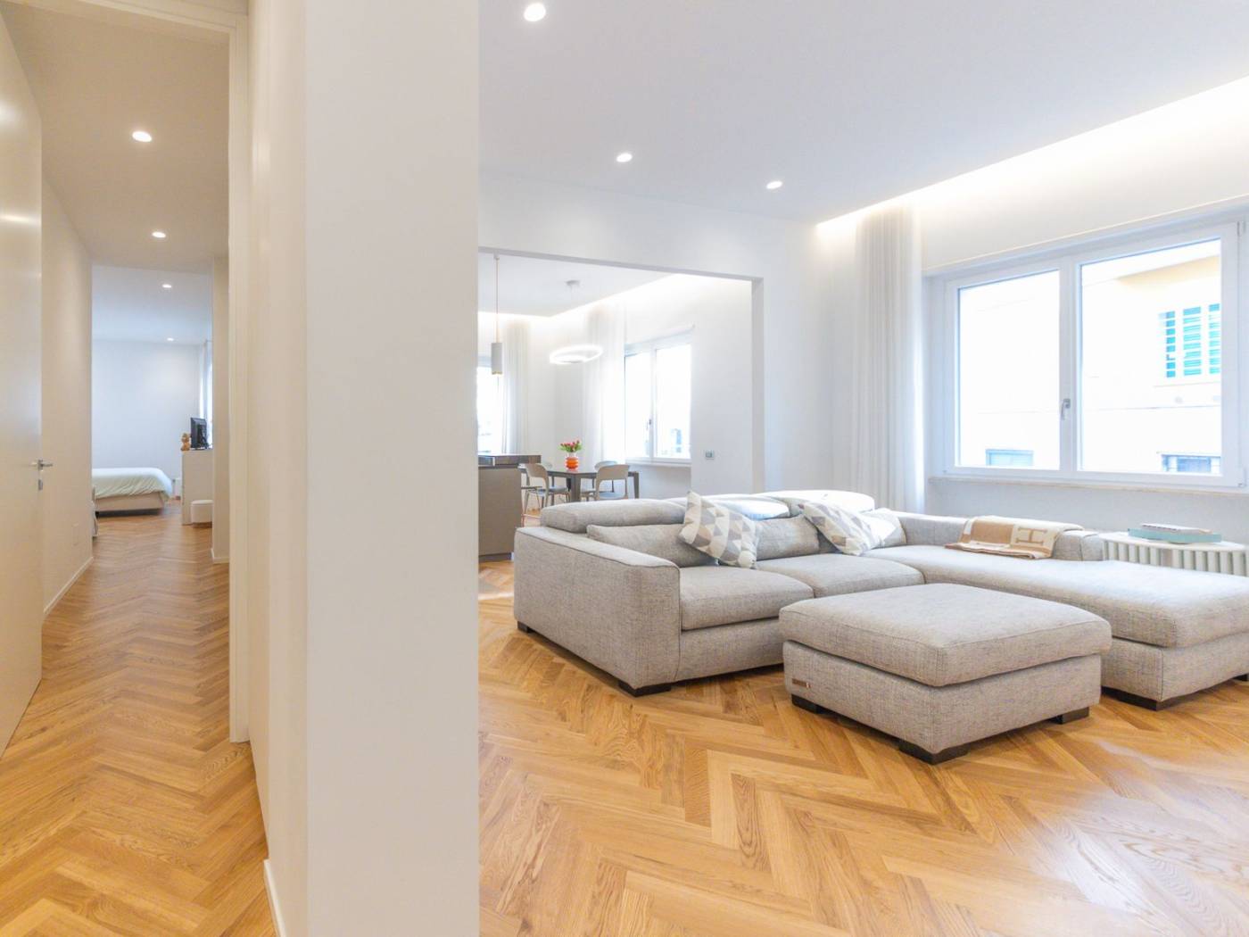 Ogni ambiente è dotato di impianti all'avanguardia: dall'impianto idraulico rinnovato, alle porte blindate, agli armadi a muro su misura, passando per la cucina Ernesto Meda, attrezzata con penisola, doppio forno, piano cottura a induzione e doppio lavandino. Inoltre, la presenza di climatizzatori in ogni stanza e delle prese internet, assicura un comfort tecnologico senza compromessi. I tre bagni sono arredati con docce walk-in e finiture di pregio, mentre le camere sono arredate con gusto, con luci in vetro e parquet a spighe che arricchiscono gli spazi.