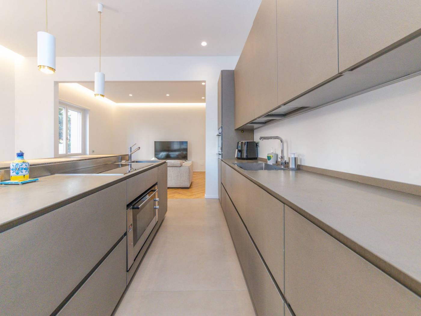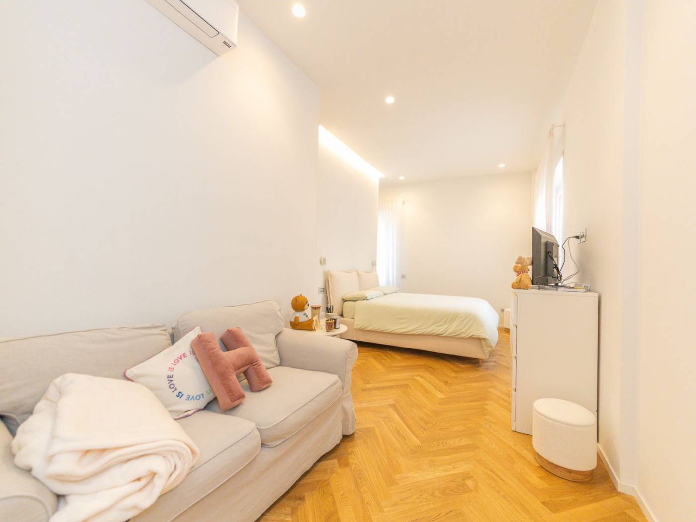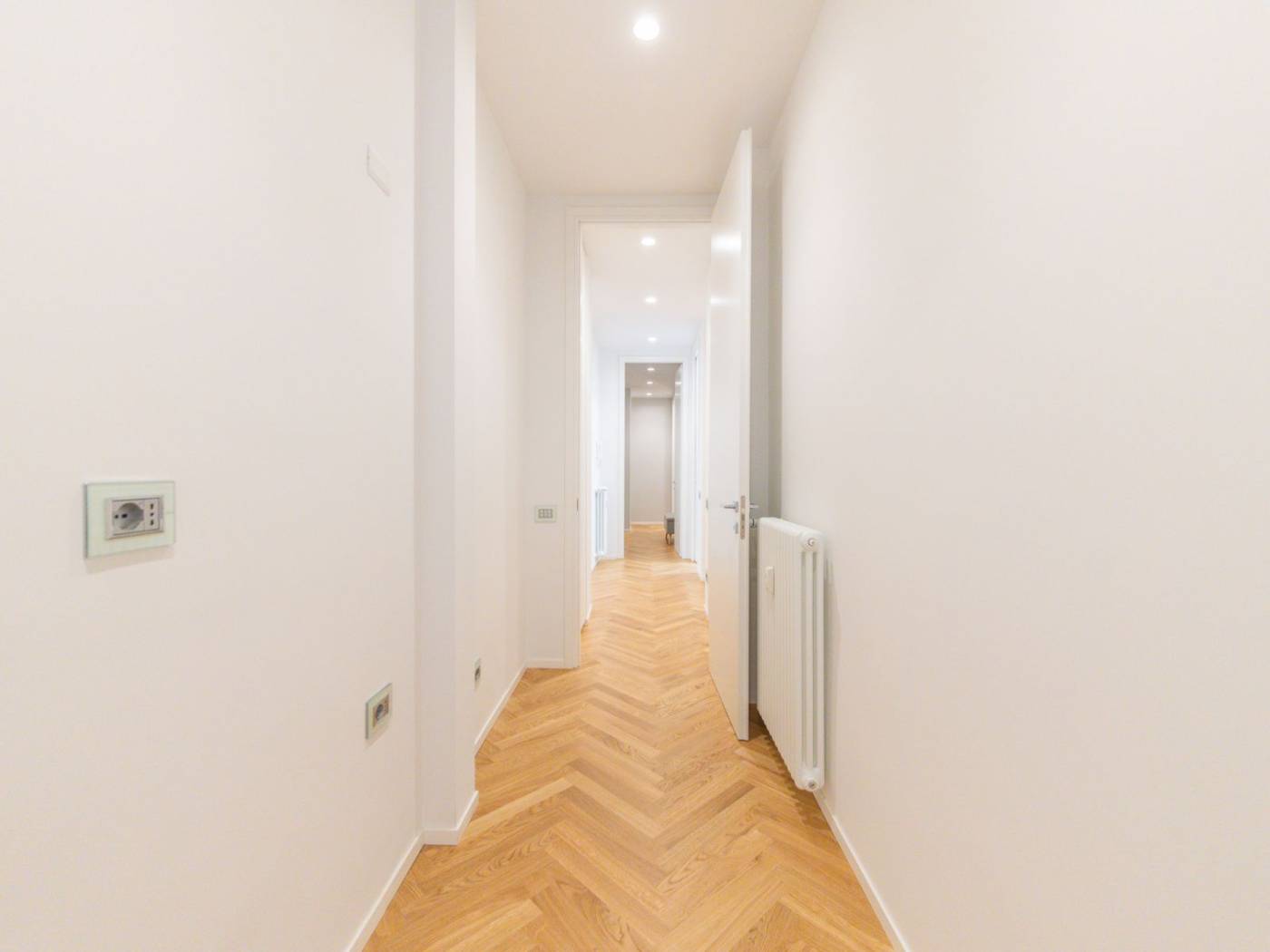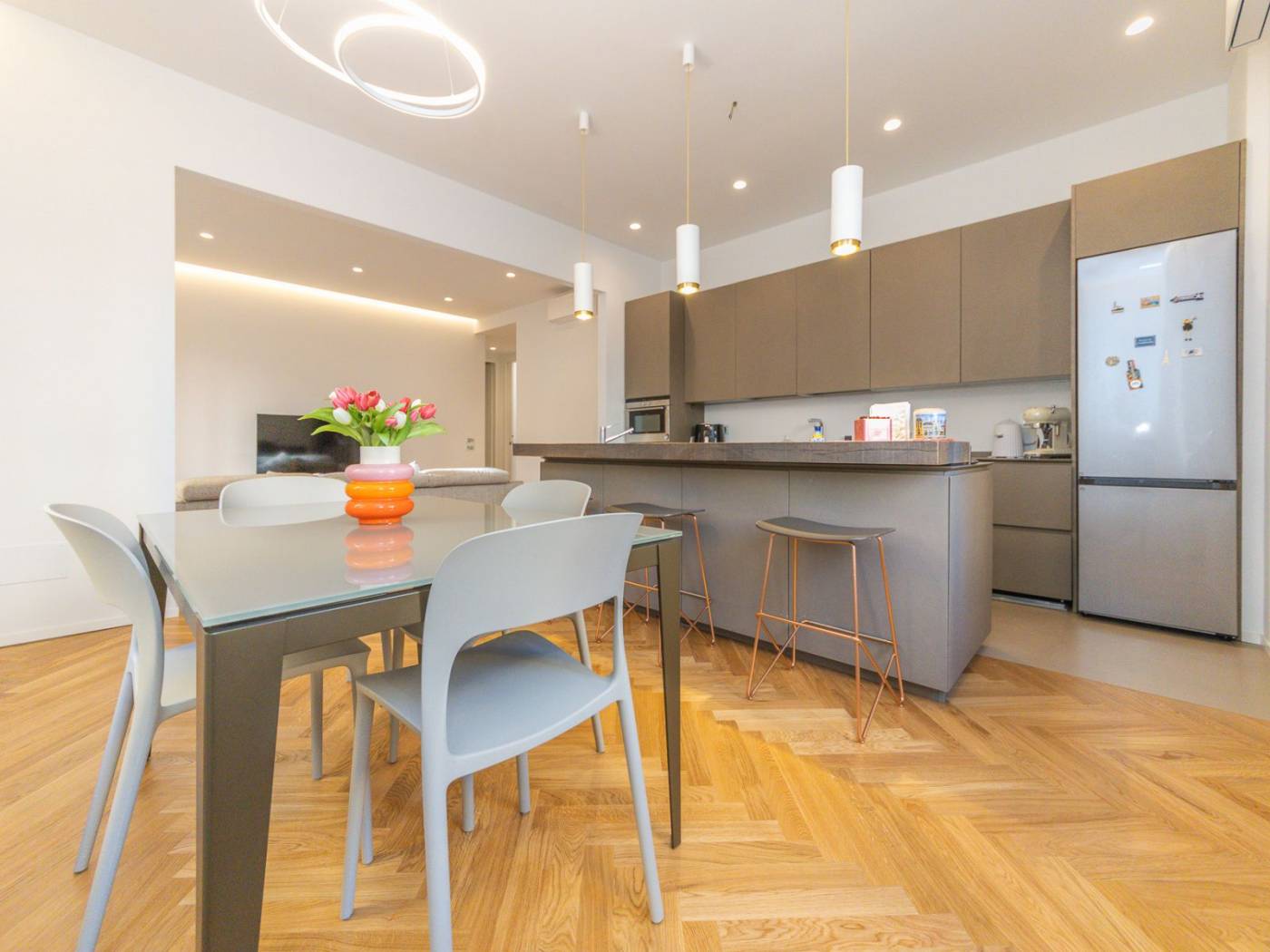 Ogni ambiente è dotato di impianti all'avanguardia: dall'impianto idraulico rinnovato, alle porte blindate, agli armadi a muro su misura, passando per la cucina Ernesto Meda, attrezzata con penisola, doppio forno, piano cottura a induzione e doppio lavandino. Inoltre, la presenza di climatizzatori in ogni stanza e delle prese internet, assicura un comfort tecnologico senza compromessi. I tre bagni sono arredati con docce walk-in e finiture di pregio, mentre le camere sono arredate con gusto, con luci in vetro e parquet a spighe che arricchiscono gli spazi.